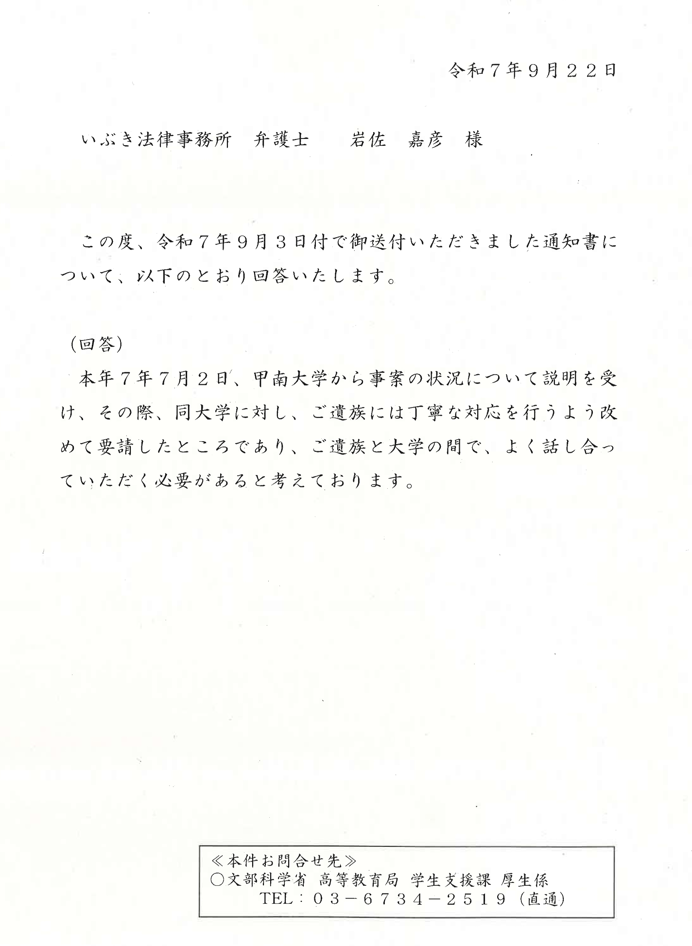 甲南大学学生自死事件、再度文部科学省に通知書を送付したところ、回答がありました!