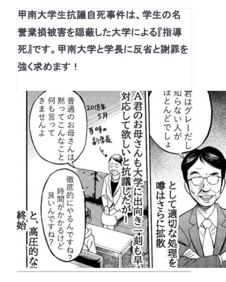 本事件のご遺族、代理人と本ブログ関係者はこのほど、Change org 署名「甲南大学生抗議自死事件は、学生の名誉棄損被害を隠蔽した大学による『指導死』です。甲南大学と学長に反省と謝罪を強く求めます!」立上げました。本事件の端緒となった不当処分を下し、現在学長を務めていて、来年3月に退任が予想される中井氏、及びその処分を7年間隠蔽し続けてきた甲南大学に、本事件についての説明・反省。謝罪を求めるべく、然るべき時期に本書名の声を届けたいと思います。また、文科省にも署名の経緯を通知する予定です。
