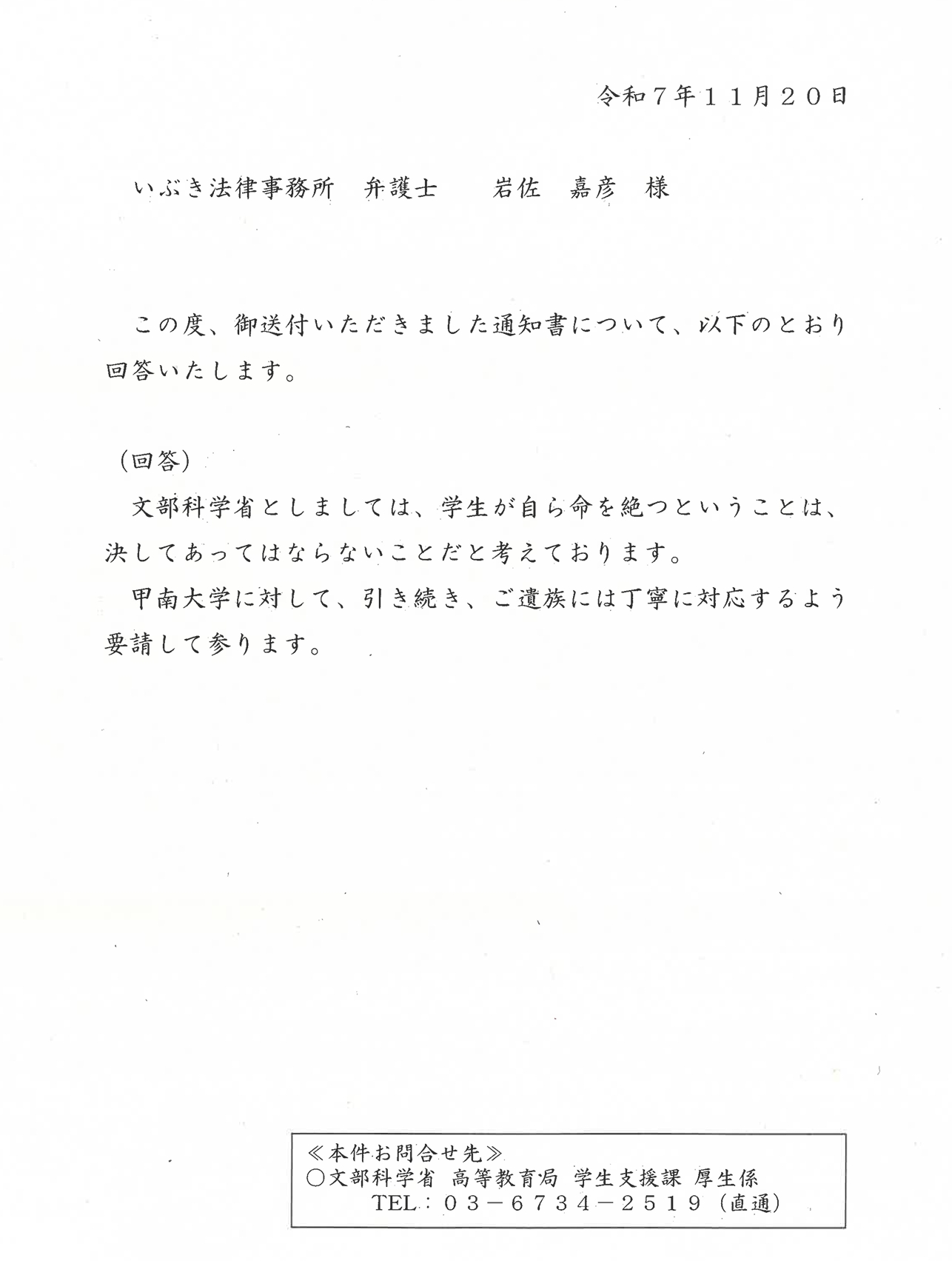 甲南大学学生自死事件 文科省から新たな回答を得ました。